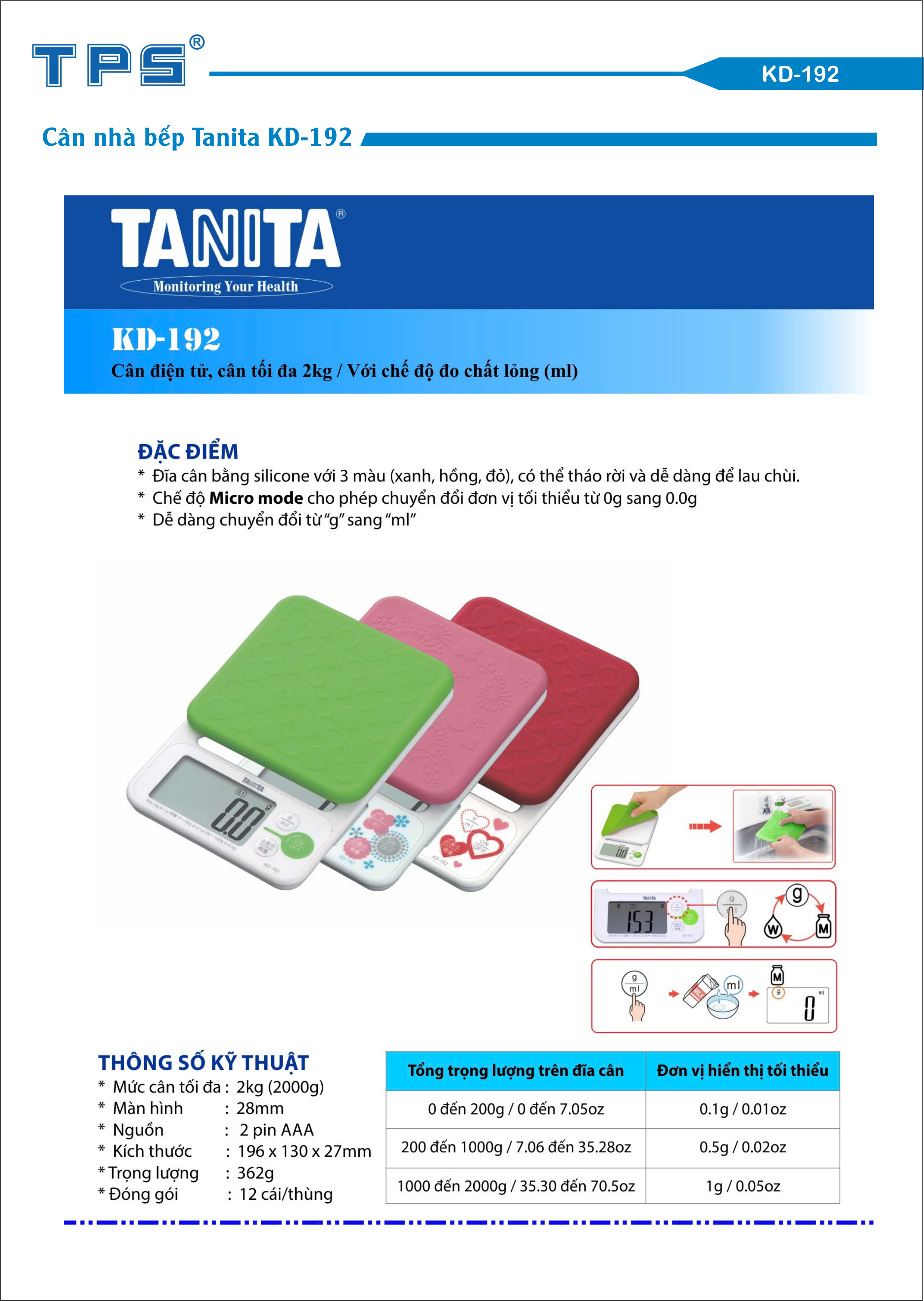 - Cân Điện Tử Nhà Bếp Tanita KD-192: Thiết kế kiểu dáng nhỏ gọn phù hợp cân nhà bếp, khách sạn hoặc các ngành dịch vụ.